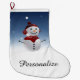 Cute personalized snowman Christmas stocking. This unique 3D snowman has a red hat, earmuffs and scarf. He has the classic snowman design, with round black eyes, a carrot nose, black coals smile, three buttons down the front and sticks for arms. The winter wonderland background has light falling snow against a blue sky. Great holiday home decor ideas for kids or for family.