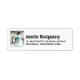 Étiquettes de adresse avec un dessin mignon avec un bonhomme de neige portant un chapeau et une écharpe cool. L'arrière - plan a une ligne de pins blancs recouverts de neige.