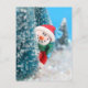 Cute smiling snowman hiding or peeking from behind a tree with glitter snow and blue sky making a winter wonderland