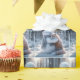 A snowman warmly embraces a snow-covered fox both surrounded by a serene winter forest