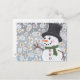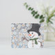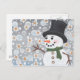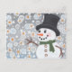 Cheerful snowman in a snowstorm of daisies and snowflakes. Snowman is smiling and waving, carrot nose, coal button eyes and smile, green scarf, and brown buttons. Blue-grey sky. Original artwork with acrylic paints.