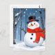 Snowman in cold forest with red scarf postcard