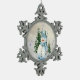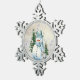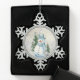 "Snowman in Falling Snow" with Rabbit and Trees Snowflake Pewter Christmas Ornament. Celebrate the holiday spirit with this charming snowman in falling snow ornament, perfect for adding a touch of whimsy to your Christmas tree. Crafted from durable pewter, this delightful piece features a snowman standing among pine trees with a bunny rabbit by his side. This elegant snowflake shaped ornament is finished with a lovely silver braided ribbon, making it a beautiful addition to your festive decor. Pair it with our coordinating Christmas Tree Skirt and 3 Canvas Holiday Print on a Wooden Ledge for a complete holiday look, or gift it to a loved one to spread the joy of the season.