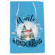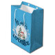Cute snowman in a snow globe with snowflakes on aqua blue background.