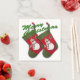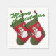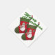 Your personalized napkin design features a duplicate photograph of a red and green stocking with an adorable snowman dressed with a seasonal plaid scarf and hat set over a white background. You can remove the black outlined green Merry Christmas text then click Customize to add text in a font style, colour and size you prefer.Click Customize it! to select a background colour other than white under Edit and Background.