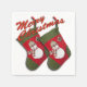 Your personalized napkin design features a duplicate photograph of a red and green stocking with an adorable snowman dressed with a seasonal plaid scarf and hat set over a white background. You can remove the black outlined red Merry Christmas text then click Customize to add text in a font style, colour and size you prefer.Click Customize it! to select a background colour other than white under Edit and Background.
