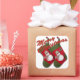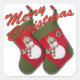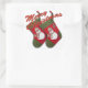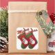 This Christmas sticker design features a duplicate photograph of a red and green stocking with an adorable snowman dressed with a seasonal plaid scarf and hat set over a white background. You can remove the black outlined red Merry Christmas text then click Customize to add text in a font style, colour and size you prefer. Click Customize it! to select a background colour other than white under Edit and Background.