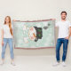Beautiful Christmas holiday throw features a cute snowman in a black top hat with holly, blue and white striped scarf on a soft blue background with white snowflakes.