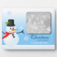 Snowman photo plaque features a cute snowman wearing a red scarf and a black hat on a fading blue background, who is enjoying the winter season as snowflakes of different shapes keep falling down. Ideal gift for Christmas or any other occasion. © Morning 6