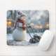 Snowman Pushing a Retro Lawnmower On Snowy Grass Mouse Pad