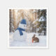 A snowman is scowling at a rabbit that is eating his carrot nose in the winter woods