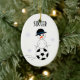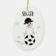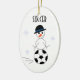 A cute snowman soccer player design featuring a snowman with a soccer ball for part of his body. A top hat and a carrot nose accent him.