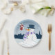 Snowman illustration in a Christmas scene with his own personal stocking pegged and hanging from a washing line.