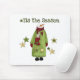 An old country look snowman wearing a green and red gown, bunny morning slippers, and a scarf, green and gold stars, and text that reads "Tis the Season" on snowman theme T-shirts, cards, mugs, magnets, tote bags, and more.