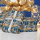 A cheerful snowman wearing a scarf and hat stands in a snowy forest surrounded by illuminated trees with Christmas lights