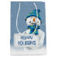 Cute snowman with white Happy Holidays sign in snowflakes on a blue background.