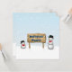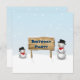 Illustration graphique hivernale montrant deux mignons bonhommes de neige tenant une enseigne en bois avec l'invitation de fête d'anniversaire dans un environnement enneigé.