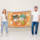 Snowmen Orange Dots and Snowflakes holiday throw blanket, so pretty and colourful, features white snowflakes on an orange background with an orange layer with white dots and a snowman couple wearing a top hat, teal winter hat, and winter scarves.