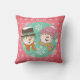 Snowmen Pink and Blue holiday pillow, so pretty and colourful, features a white snowflakes on pink background with an aqua blue circle with white dots and each side has a smiling snowman couple with a hat, scarf, carrot nose, and snowflakes!