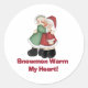 A snowman couple embraces in a hug and red text reads "Snowmen Warm My Heart!" on snowman holiday greeting cards, tote bags, mugs, magnets, T-shirts, and more.