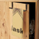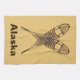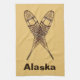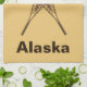 A crossed pair of snowshoes on a background colour suggesting braintan leather. Customizable text reading "Alaska" also appears. There are several different styles of traditional snowshoes. Those pictured here are made of Ash and moosehide babiche (webbing) in the Alaskan pattern. Longer and thinner than some other styles, such as the bearpaw, Alaskan snowshoes allow for a more natural gate and are well suited for cross-country travel. The slightly upturned tips allow you to drag your feet a bit. Be advised snowshoes can make for excellent skies; generally at the worst possible moment.