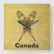 A crossed pair of snowshoes on a braintan leather background. Customizable text reading "Canada" also appears. There are several different styles of traditional snowshoes. Those pictured here are made of Ash and moosehide babiche (webbing) in the Alaskan pattern. Longer and thinner than some other styles, such as the bearpaw, Alaskan snowshoes allow for a more natural gate and are well suited for cross-country travel. The slightly upturned tips allow you to drag your feet a bit. Be advised snowshoes can make for excellent skies; generally at the worst possible moment.