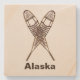 A crossed pair of snowshoes. Customizable text reading "Alaska" also appears. There are several different styles of traditional snowshoes. Those pictured here are made of Ash and moosehide babiche (webbing) in the Alaskan pattern. Longer and thinner than some other styles, such as the bearpaw, Alaskan snowshoes allow for a more natural gate and are well suited for cross-country travel. The slightly upturned tips allow you to drag your feet a bit. Be advised snowshoes can make for excellent skies; generally at the worst possible moment.