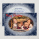 A modern photo Christmas card design with your family photo highlighted inside a snowy blue oval frame. This design carries over to the back for your custom Christmas greeting, your names and space for your handwritten personal note.