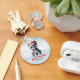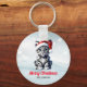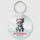 Cute snow leopard baby wearing Santa hat at snowy winter season Christmas keychain.