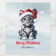 Cute snow leopard baby wearing Santa hat at snowy winter season Christmas wine label.