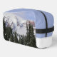 Zippered dopp kit toiletry bag that features a scenic photo image of a snowy Mount Rainier evergreen trees landscape along with a solid, light blue top and white sides. Perfect accessory bag for your toiletries for on-the-go travel!