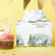 This scenic custom wrapping paper features a winter mountain landscape. Beautiful, snowy rocky mountains are pictured in the distance, with a forest of pine trees featured in the foreground. A flock of birds is flying away in the distance.