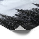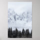 Stunning winter landscape photograph of cloudy snow covered mountains and spruce forest below.
