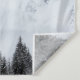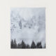 Stunning winter landscape photograph of cloudy snow covered mountains and spruce forest below.