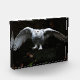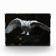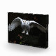Snowy Owl With Open Wings - Photograph of a snowy owl standing on a log with wings spread and looking directly at the camera.