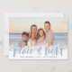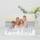 Modern Hanukkah photo cards feature your favourite image with a white snowflake border along the bottom. "Peace and light" appears in light blue hand lettered brush typography, with your names and the year beneath.