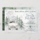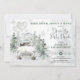 Beep, Honk, Shout and Wave! Unique drive-through birthday invitation featuring an adorable baby elephant sleeping on top of a chic silver & white car, watercolor pine trees and cute frosty snowflakes