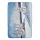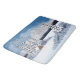 A bath mat with a beautiful winter scene including snowy mountains, rustic cabin and snow covered evergreens. Original artwork by W.B.