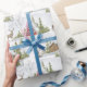 This Christmas wrapping paper features snow covered log cabins and red A-frame cabins with deer and reindeers in the snow.