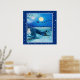 A teal & dark blue snowy star background with a snowman and a flying Santa on his sleigh sending reindeer through the sky fantasy scene.