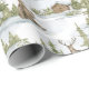 This Christmas wrapping paper features snow covered log cabins with deer and bears in the snow.
