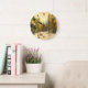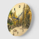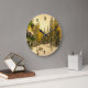 A clock with a beautiful nature photograph. An isolated winter path with tall snow covered pine trees.