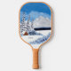A pickleball paddle with a beautiful winter scene including snowy mountains, rustic cabin and snow covered evergreens. Text can be personalized or omitted. Original artwork by W.B.