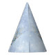 This adorable snowy winter Princess party hat features a beautiful young princess with red hair wearing a blue and white snowflake gown and warm fur lined cape. The princess is surrounded by poinsettias.