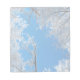 A snowy winter scene looking up through the trees that are covered with snow against a bright blue sky.