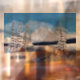A window cling with a beautiful winter scene including snowy mountains, rustic cabin and snow covered evergreens. The image and text can be personalized. You also have the option to delete the text. Original artwork by W.B.