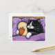 Whimsical cat postcard. After a long hard day of mischief, Sox the cat loves to snuggle up with his favourite duck toy for a long snooze. Artwork © Lisa Marie Robinson.