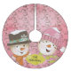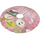 So Many Snowman holiday tree skirt features a vintage pink background with little brown snowmen and snowflakes and a cute snowman couple in top hat and a pink winter hat and striped scarves. You can easily add your family name to the mustard yellow banner before ordering to personalize it! This cute snowman design Christmas tree skirt makes a great gift or get one for yourself to enjoy for years to come!po