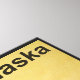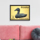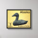 A postage stamp from a mythical independent Alaska featuring a soapstone carving of an Eider Duck. The background is brain tanned moose hide. Text reading, "Alaska", "Soapstone Carving" and "Postage 3 Nuggets" also appears.