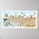 Bright and detailed whimsical vision of Southern California - featuring Los Angeles and San Diego and Orange County plus many major cities and most beach towns - zany characters play on the beach and desert, mountains and valleys. This charming scene has it all – a surfer hangs ten while a mermaid lounges on a rock, a killer whale leaps out of the water as a t-rex roars a challenge, a muscular beach couple both flex to impress, zoo animals wait for tourists and a bull smashes into a bull fighter… And MUCH more...